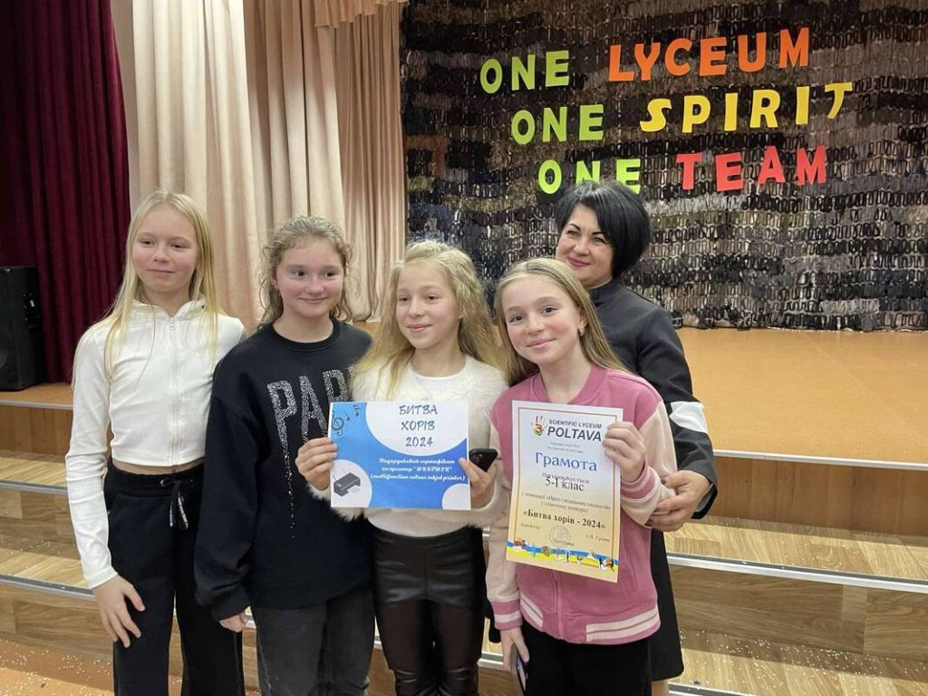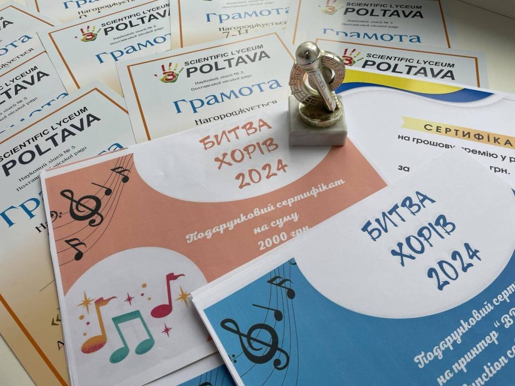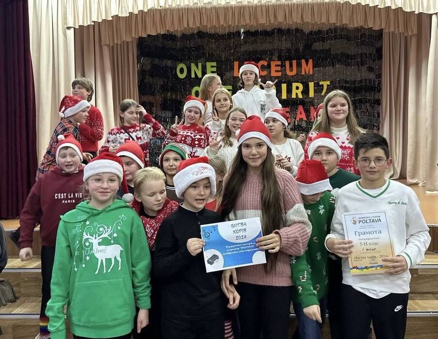 Битва Хорів цьогоріч стала надзвичайно важливою подією! На жаль, через постійні повітряні тривоги важко було не тільки готуватися до конкурсу…важко було взагалі хоч щось планувати … Через складну безпекову ситуацію відбір у фінал відбувався заочно: члени журі переглянули 19 відеозаписів з виступами дітей і обрали 10 колективів, які вийшли у фінал. 26.12 відбувся фінал конкурсу, спонсором якого стали БО Наша рідна школа і Полтавський міський осередок Волонтерського штабу «Українська Команда». Усі виступи були цікавими, яскравими й талановитими. Це відмітили всі члени високоповажного журі (Наталія СУЛАЄВА, заслужена артистка України, доктор педагогічних наук, доцент, професор кафедри музики, декан факультету педагогічної і мистецької освіти; Євген ДУДНИК, директор Полтавської дитячої музичної школи № 1 ім. П.І. Майбороди, заслужений працівник культури України; Наталія МІЗЄВА, заслужена артистка України; Юлія ІЩЕЙКІНА, очільниця Полтавської міської партійної організації «УДАР», професорка, доктор медичних наук, підприємець; Надія ЗУБКО, волонтер “Української команди”; Данило РЕВЕКА, викладач ДМШ1). У залі вирували емоції, зі сцени звучали пісні у виконанні ліцеїстів. Вітаємо переможців цьогорічного конкурсу Битва хорів: Гран-прі отримав 8а клас (їхня пісенна композиція змусила піднятися весь зал, зі сльозами на очах аплодувало стоячи журі) 1 місце вибороли 11а, 7н, 7б, 6н, 5н. 2 місце посіли 10с, 10а, 9м, 9а. Упродовж 25 грудня було організовано голосування за кращу композицію (приз глядацьких симпатій). Голосували через Моя школа, найбільшу кількість голосів отримала композиція 5І. Вітаємо колектив 5і! Переможці визначені, подарунки отримані( кольорові принтери, сертифікат на 4000 грн від Полтавського міського осередку Волонтерського штабу «Українська Команда», сертифікати на 2000 грн від БО Наша рідна школа). Дякуємо ЗСУ за можливість жити! Дякуємо кожному захиснику й захисниці за те, що є можливість подарувати нашим дітям радість дитинства! Віримо в Перемогу!